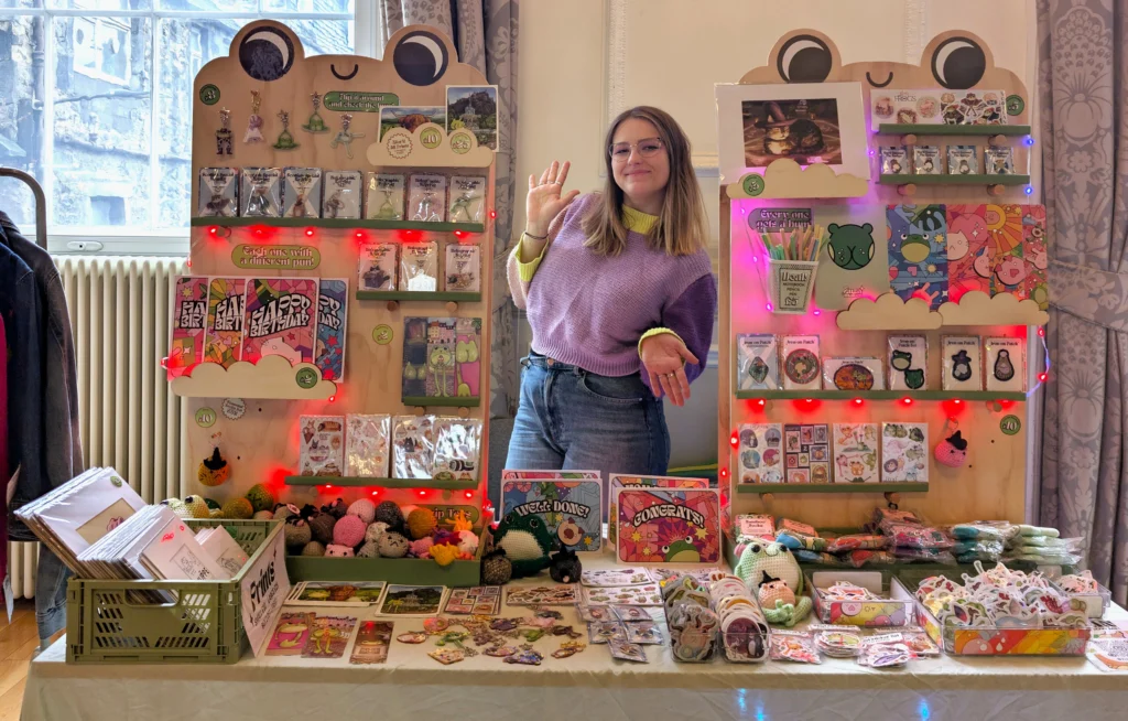If you’d like to purchase one of the hand-made, one of a kind items such as the denim jackets, crochet frogs or jumpers, feel free to come to one of the live events! You will get to meet the mind behind the madness too (or indeed one of her minions covering for her when she’s out for a wee break).